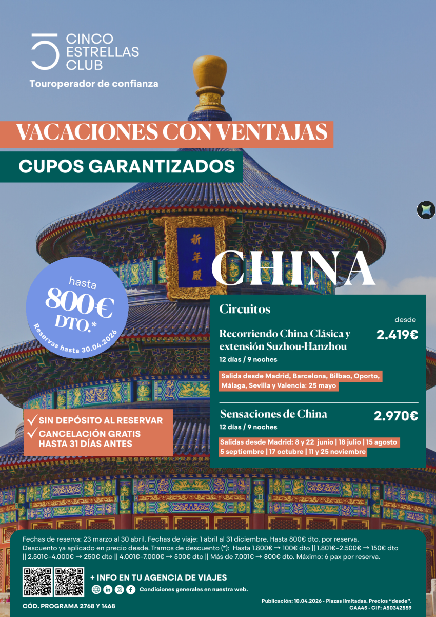 Hsta 800€dto.reserv.hsta 30.04 Cupos| China 12ds/9ns dsd 2.419€ sal. may-nov dsd Mad,Bcn,Bio,Opo, Agp,Svq,Vlc